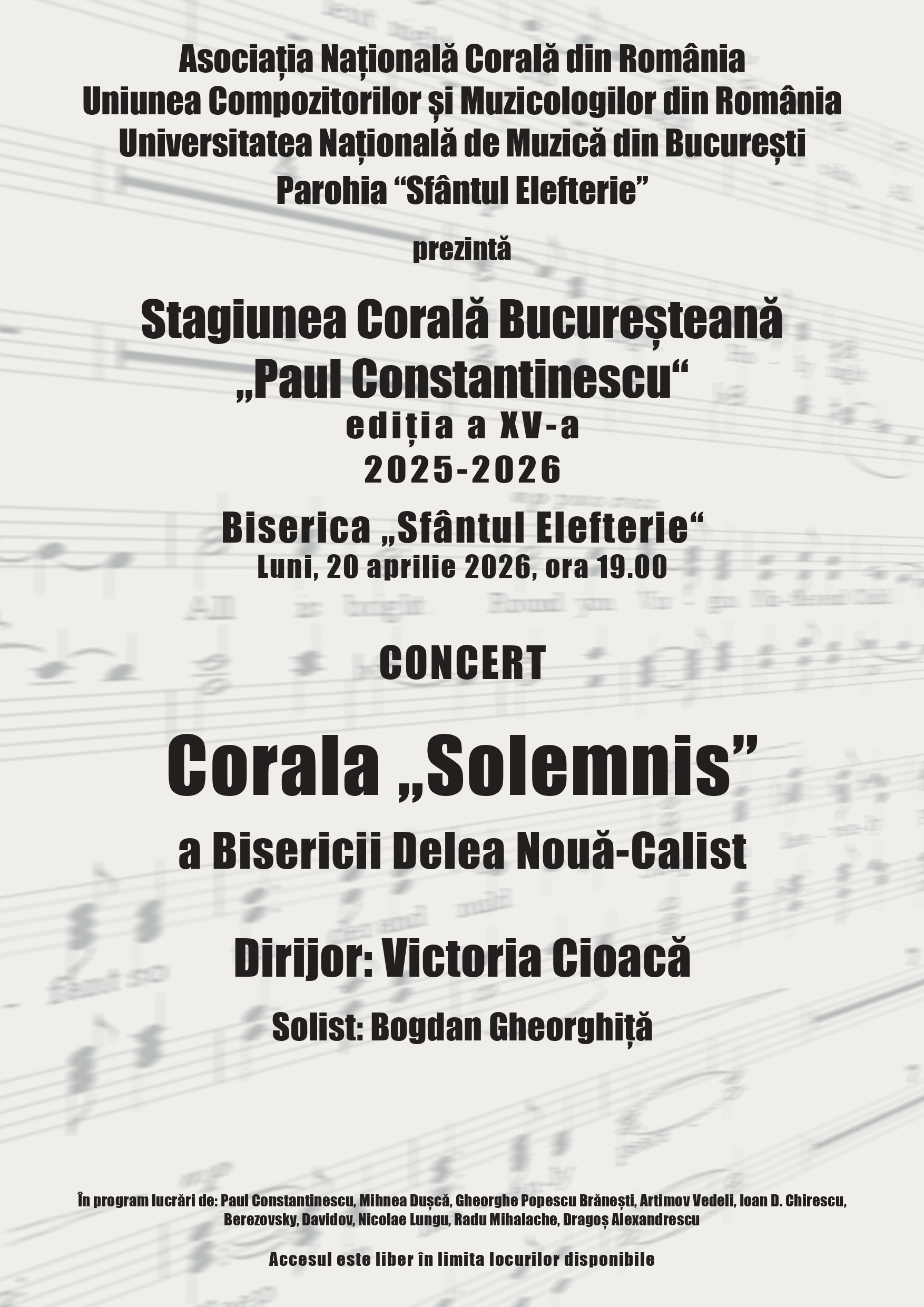 În program, lucrări de Tiberiu Brediceanu, Șerban Marcu, Iulian Cârstoiu, Gavriil Musicescu, Filaret Barbu, Vasile Timiș, Tudor Flondor, M. Waeber, John Rutter.